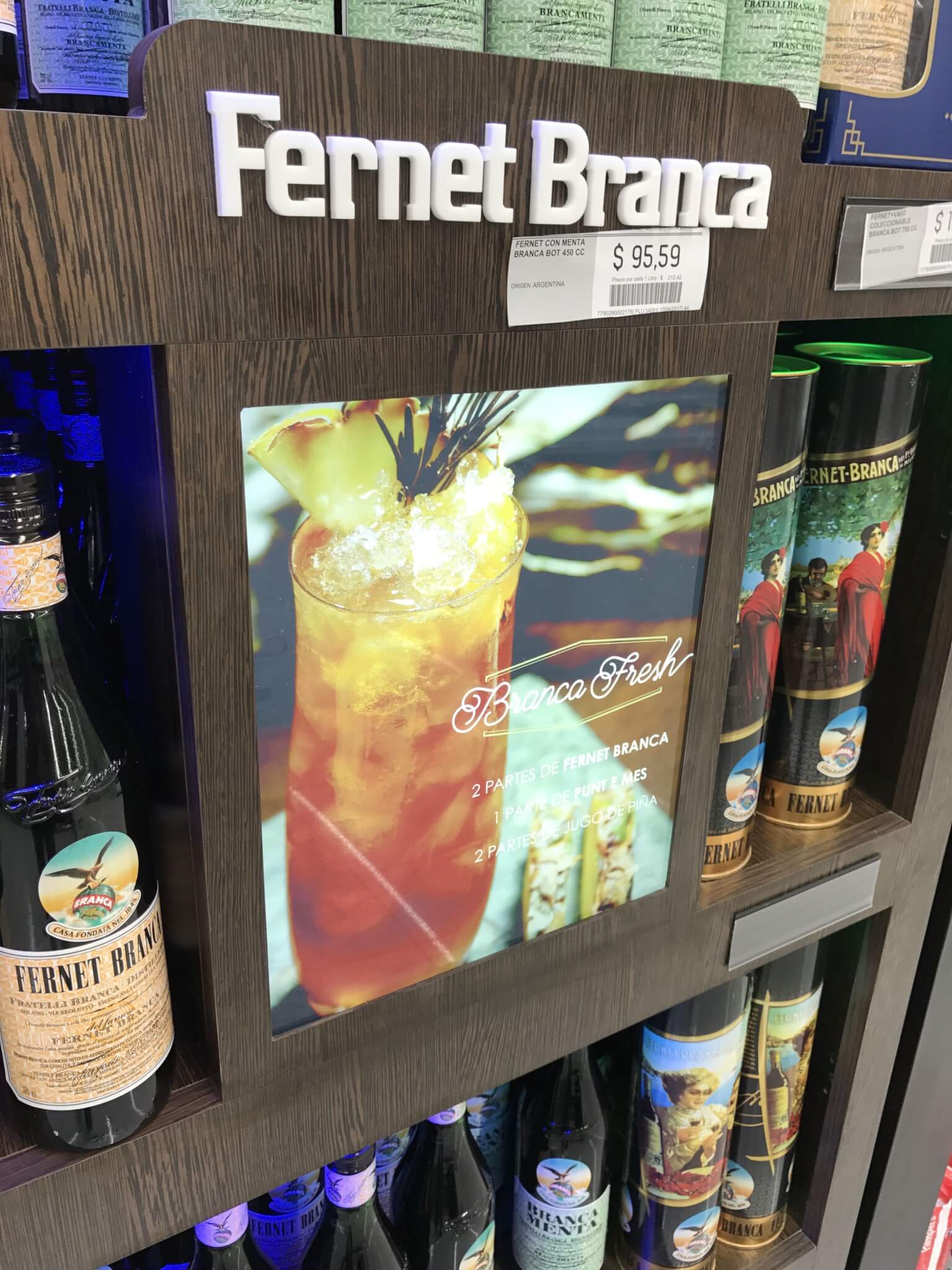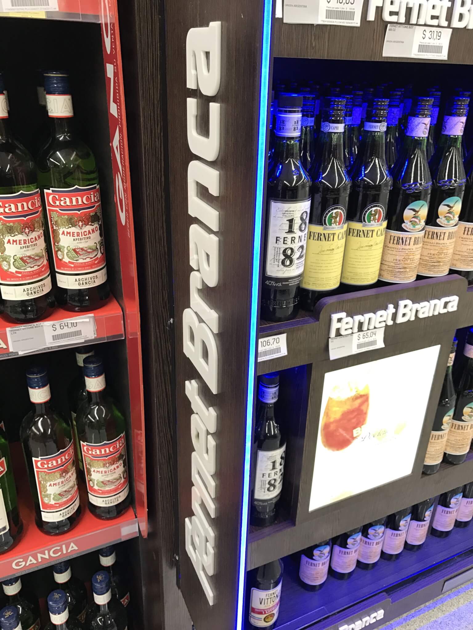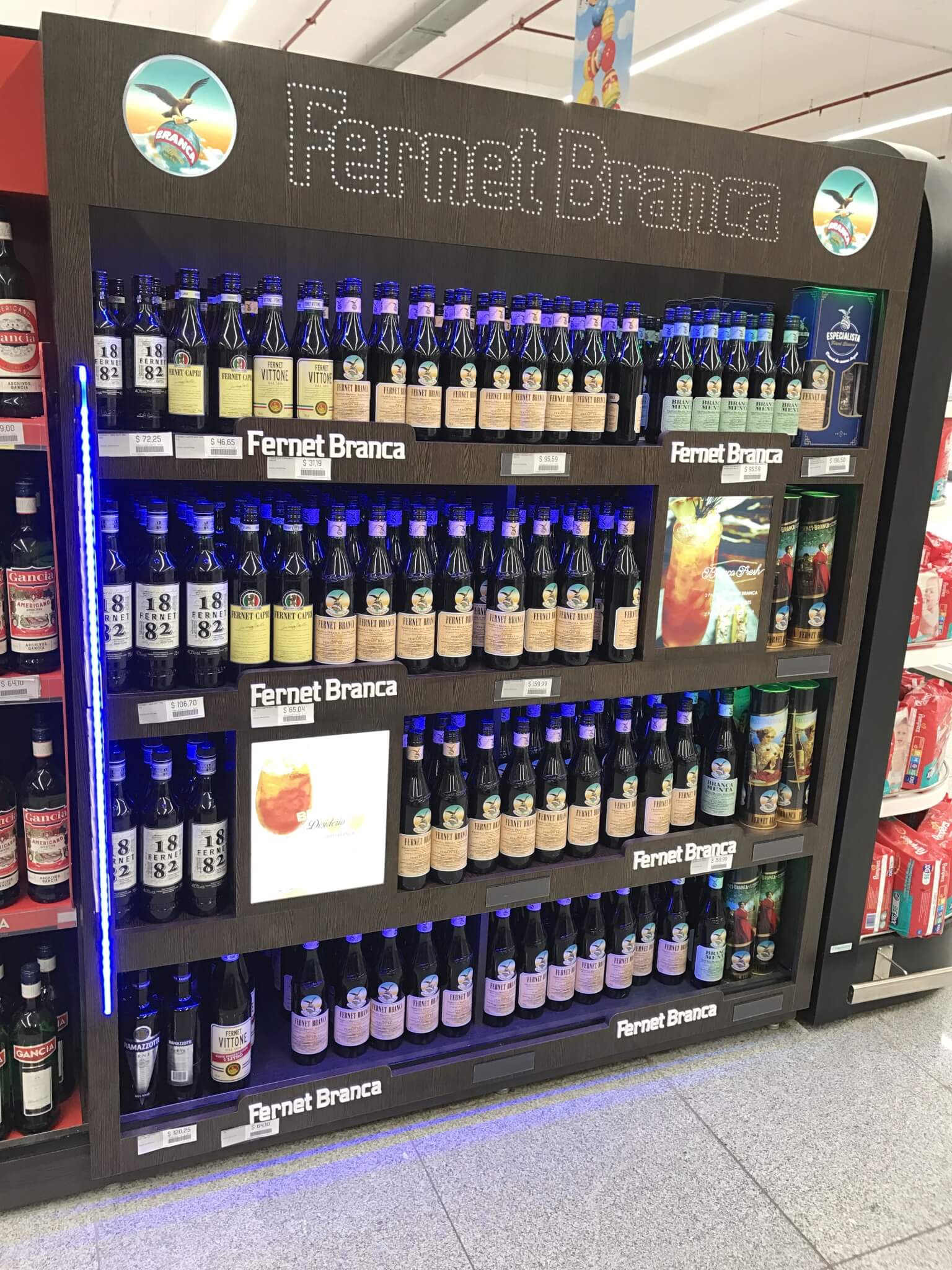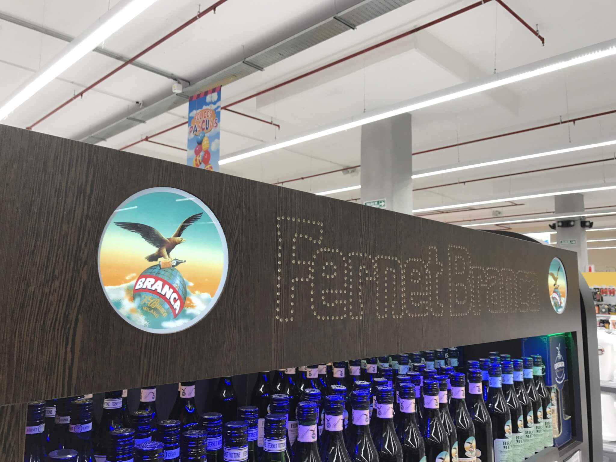 Revestimiento de góndola de Melamina, con gráficas backlights impresas en Duratrands, transilumindas con leds.